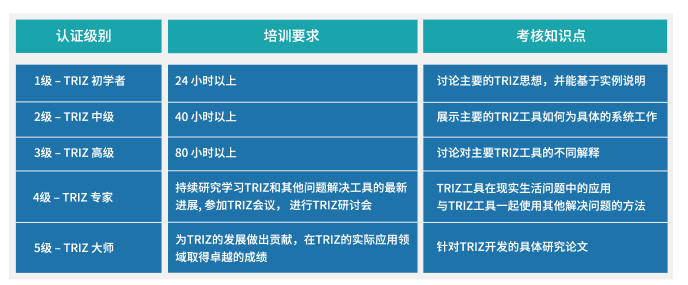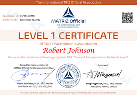 遵循在全球傳播 TRIZ 知識的傳統,MATRIZ OFFICIAL 繼續對不同級別的 TRIZ 專家進行認證;認證涵蓋所有級別的 TRIZ 知識和技能:從初學者(1 級)到 TRIZ 大師(5 級)。 所有認證活動均由 MATRIZ OFFICIAL 的認證委員會 (CC) 和 TRIZ Master 認證委員會 (TMCC) 執行。