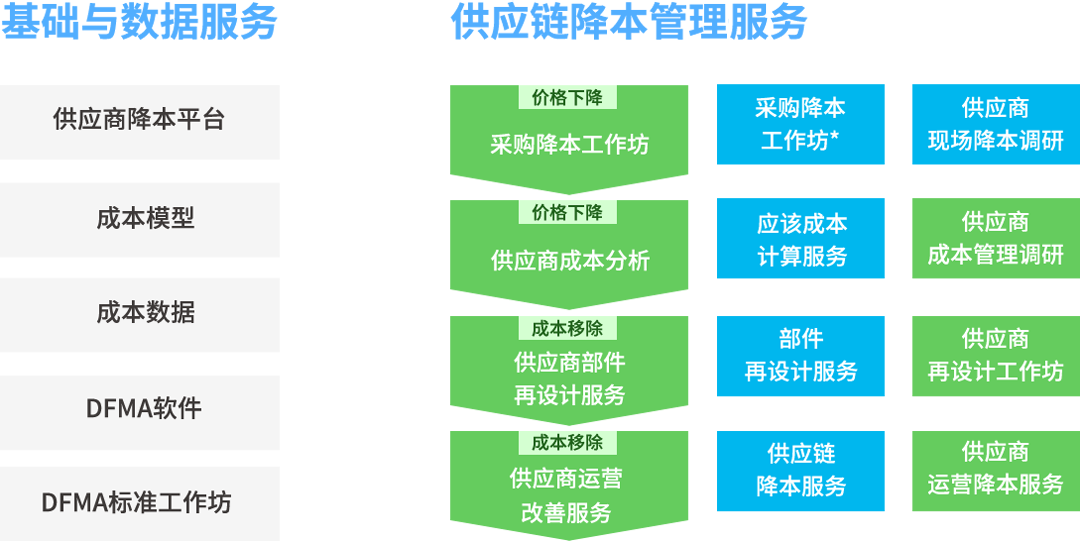 科理供應鏈降本主要以國際降本軟件DFMA(DFMA是用以簡化設計,實現低成本、高質量的生產制造的結構性方法,是在價值分析和價值工程(VAVE)方法的基礎上,更適合落地實施的產品降本方法。)為工具,配合科理顧問多年降本工作經驗,為企業實現真正的降本。我們主要分為兩大階段,以價格為焦點和以成本為焦點。以價格為焦點,我們通過采購工作坊模式,以DFM為工具,計算出所要采購零部件的應該成本,識別供應商報價存在的水分,制定談判策略,通過供應商談判達到合理報價。以成本為焦點,通過DFA分析識別優化設計的機會,達到成本的移除,最終實現采購價格的降低。供應商通過部件再設計和運營改善,以設計降本,以精益降本,實現協同降本,達到雙贏的局面。