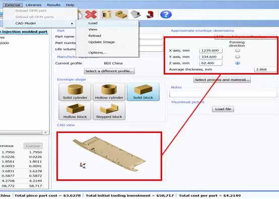 上面是用DFM導入零部件3D數模的截圖,軟件可直接讀取數模(產品零部件)的尺寸,然后選擇合適的材料和工藝進行成本計算。