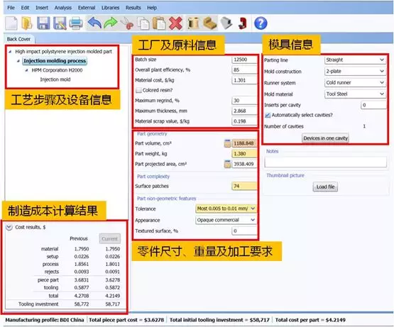 選擇了合適的材料和工藝后,DFM可以自動生成制造工藝步驟,并從數據庫中調出工廠及原料信息、零件尺寸、體積、重量的計算,零件加工要求、模具信息等。如果所有信息都確認后,就可以計算出制造成本。