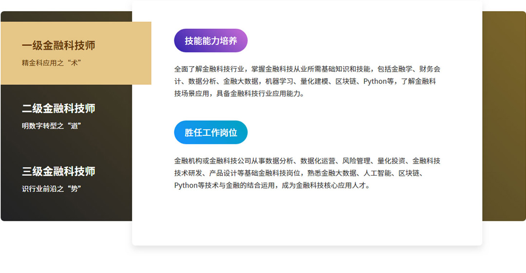 認證體系注重科學(xué)性(信度和效度), 確保認證的高含金量,確保能夠科學(xué)有效評測人才技能和能力,課程覆蓋“專業(yè)知識+實操技能+應(yīng)用能力”,培養(yǎng)既通曉金融又掌握技術(shù),能實現(xiàn)金融、科技、互聯(lián)網(wǎng)等多行業(yè)從業(yè)的復(fù)合型金融科技人才。