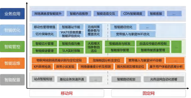 - 智能配置:隨著電信網絡越來越復雜,網絡的設計與配置過 程需要大量的人工成本和專家經驗,利用人工智能技術結合 網絡歷史數據、將專家經驗數字知識化,通過對網絡性能進 行預測和自動化操作配置,有望實現移動站點智能規劃、基 站業務快速開通、智能路徑規劃和光傳送網自動化部署等應用。
